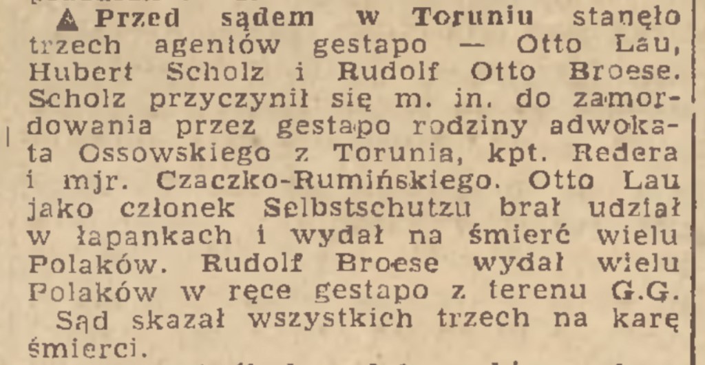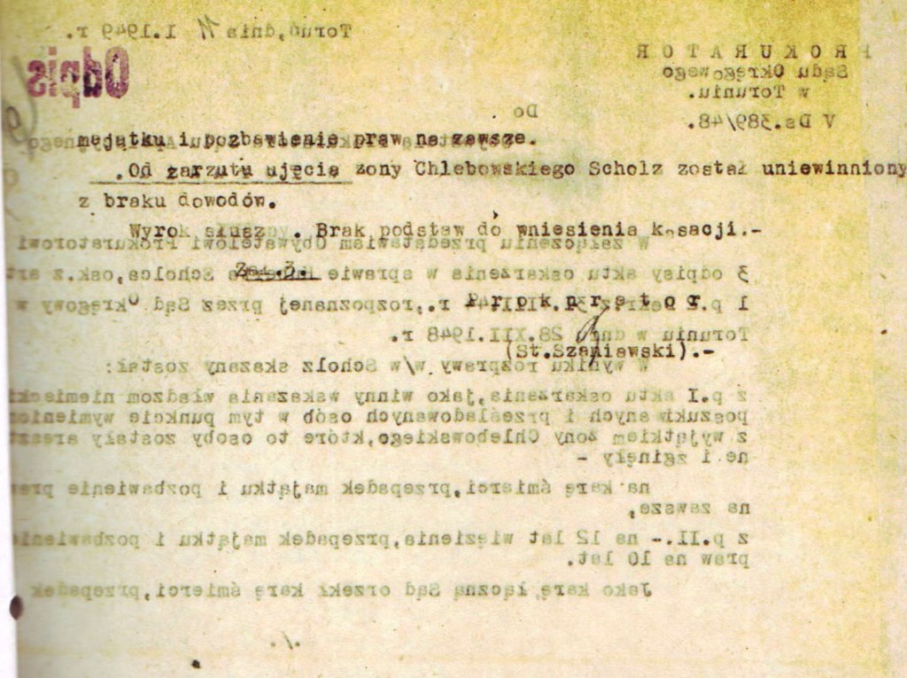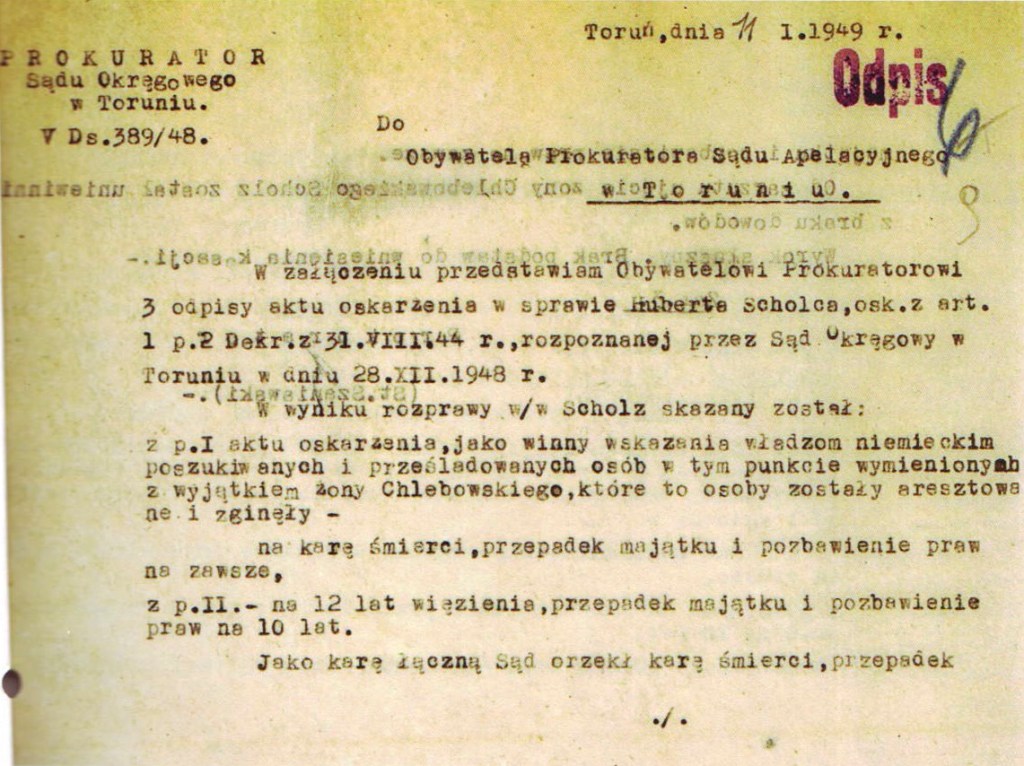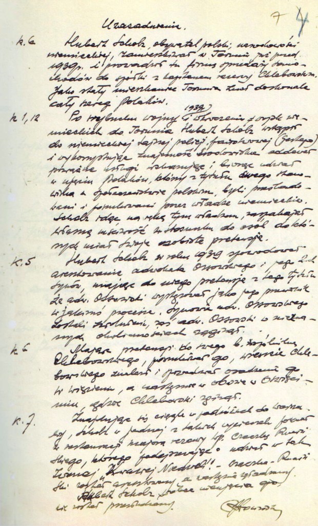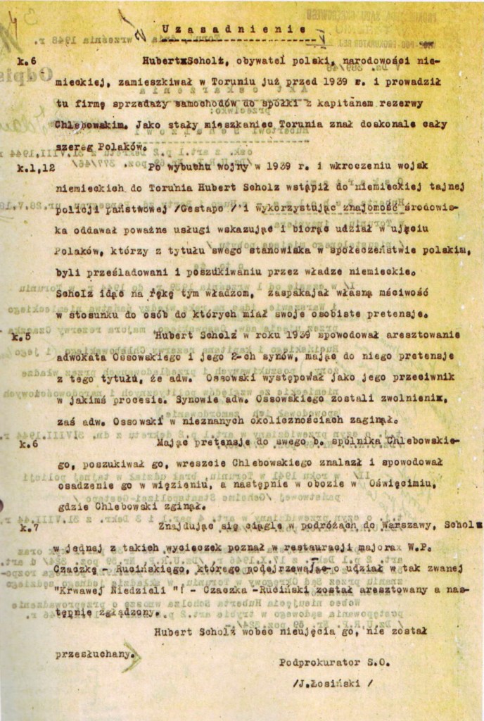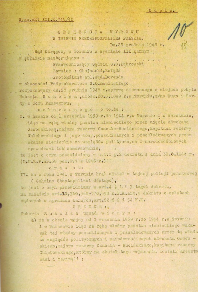 „[…] Scholz […] w czasie od 1 września 1939 r. do 1944 r. w Toruniu i Warszawie, idąc na rękę władzy państwa niemieckiego przez ujęcie adw. Ossowskiego, majora rezerwy Czaczka-Rucińskiego i kapitana rezerwy Chlebowskiego i jego żony, poszukiwanych i prześladowanych przez władze niemieckie ze względów politycznych i narodowościowych spowodował ich zamordowanie […]”