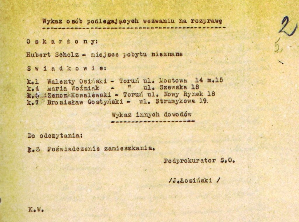 Hubert Scholz, obywatel polski, narodowości niemieckiej, zamieszkiwał w Toruniu już przed 1939 r. i prowadził tu firmę sprzedaży samochodów do spółki z kapitanem rezerwy Chlebowskim. Jako stały mieszkaniec Torunia znał doskonale cały szereg Polaków.